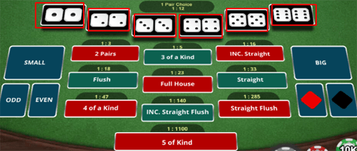 5 Of a Kind adalah menebak hasil dadu keluar dengan angka kembar sebanyak 5 dadu contoh 5-5-5-5-5 (semua angka dengan dadu kembar 5)