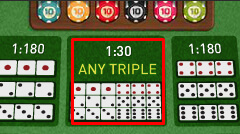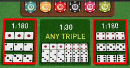 Memilih 1 nomor kembar tiga untuk keluar pada ketiga dadu (bukan salah satu dadu) pembayaran 180X pasangan ![]() |